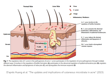 Indeed, the comparison between healthy skin and acne-prone skin highlights the central role of Cutibacterium acnes in acne pathogenesis. On normal skin, C. acnes exists as a commensal organism, in balance with other microorganisms such as bacteria, fungi, and viruses, without triggering inflammation. Immune homeostasis and barrier function are maintained. In contrast, in acne-prone skin, certain C. acnes strains proliferate excessively. They form protective biofilms (A), induce abnormal keratinocyte proliferation and differentiation accompanied by epidermal inflammation (B), stimulate sebocyte lipogenesis (C), and disrupt the skin immune response (D). This cascade of events leads to chronic inflammation and the formation of the characteristic acne lesions (3).